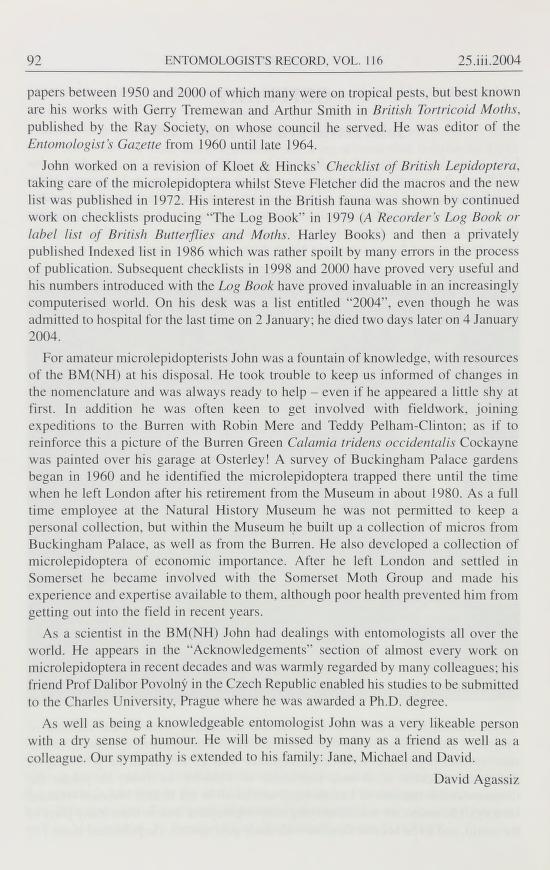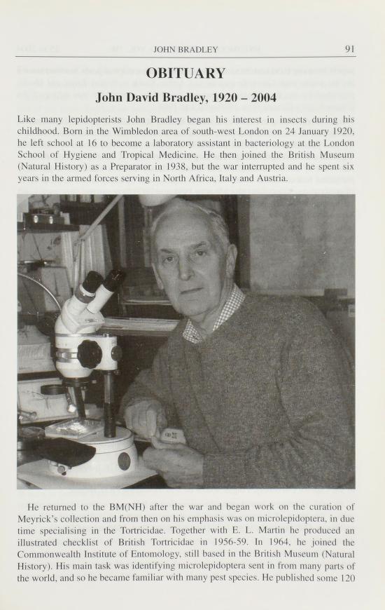 Entry in The entomologist's record and journal of variation 2004 Vol 116 pp 91-92 for John David Bradley, 1920 - 2004 by David J L Agassiz.